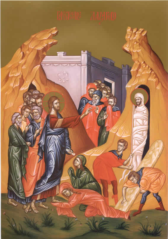 Наиме, Лазар, како нам поменуто јеванђеље свједочи, би болестан и умрије. Био је сахрањен по јеврејском обичају, а његове сестре, Марта и Марија, оплакиваху га. Након четири дана од Лазарове сахране, у село Витанију, гдје живљаху Марија и Марта, долази Гопсод Исус Христос и његови ученици са њим. Када су га среле Марија и Марта, рекоше му, у својој тузи са умрлим братом, како би он био жив да је Господ био ту раније. Господ Исус Христос их тјеши тако што каже да ће Лазар васкрснути, те пође до Лазаревог гроба. Када је видио окупљене људе како тугују за покојним Лазаром, и сам Христос заплака. Но, својом божанском силом, којој се и природа покорава, кроз ријечи: ,,Лазаре, изађи!” Лазар заиста оживје! Христос нареди да са Лазара скину погребне повоје, те да Лазар може изаћи из гроба и наставити живот.